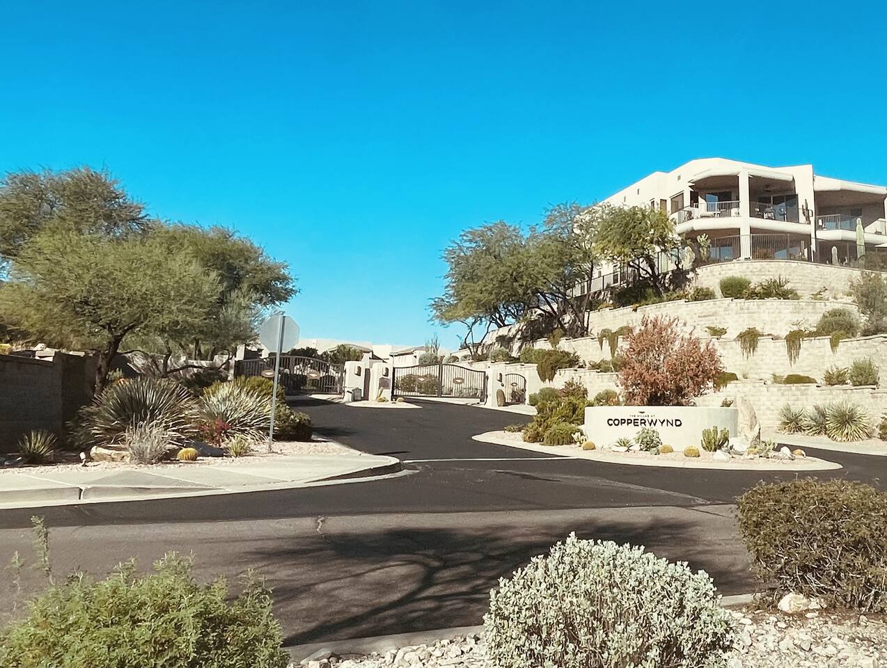 The Villa in Copperwynd is a spacious and fully furnished retreat in Fountain Hills, offering a private 2-car garage and accessed via 15 steps to the main floor. This second-story unit is adorned with plush carpeting in the bedrooms and stairs, complemented by hardwood flooring throughout the main living areas. It boasts 3 bedrooms, 3 bathrooms, a den, an office, a seating area, a living room with a flat-screen TV, a well-equipped kitchen, a dining area, and 2700 square feet of living space. Additionally, there is a 500 square feet patio complete with patio furniture for enjoying coffee, drinks, the sunrise, sunset, and indoor/outdoor living. This villa provides a perfect blend of small-town charm and modern conveniences, offering an ideal retreat for both monthly and long-term stays. Nestled in a gated community at the top of Palisades and Eagle Ridge, this villa provides stunning views of the town and Four Peaks Mountain, as well as picturesque sunsets. Guests can enjoy the serene landscape and peaceful atmosphere within walking distance to the Adero Resort.